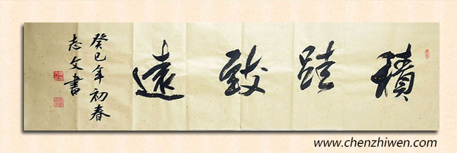 作品简介:陈志文书法作品:积跬致远。未装裱,洒金瓦当宣纸,一得阁墨汁。
